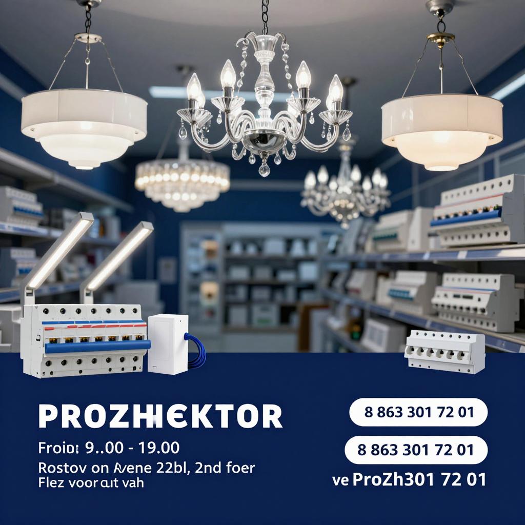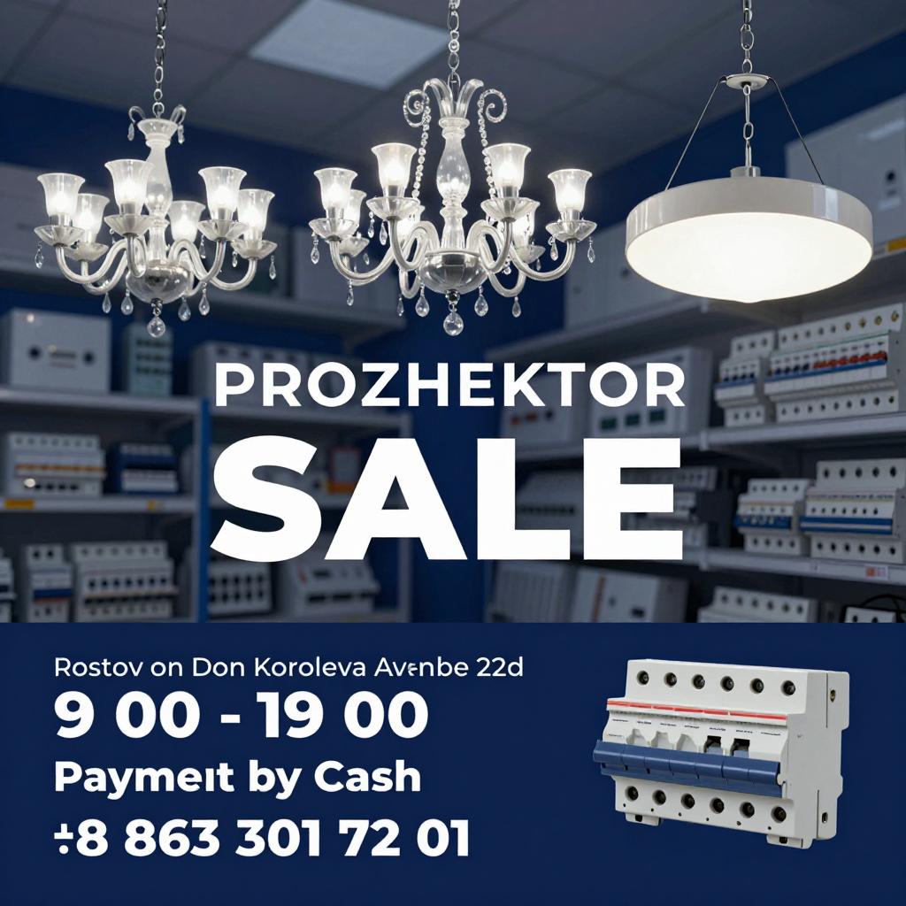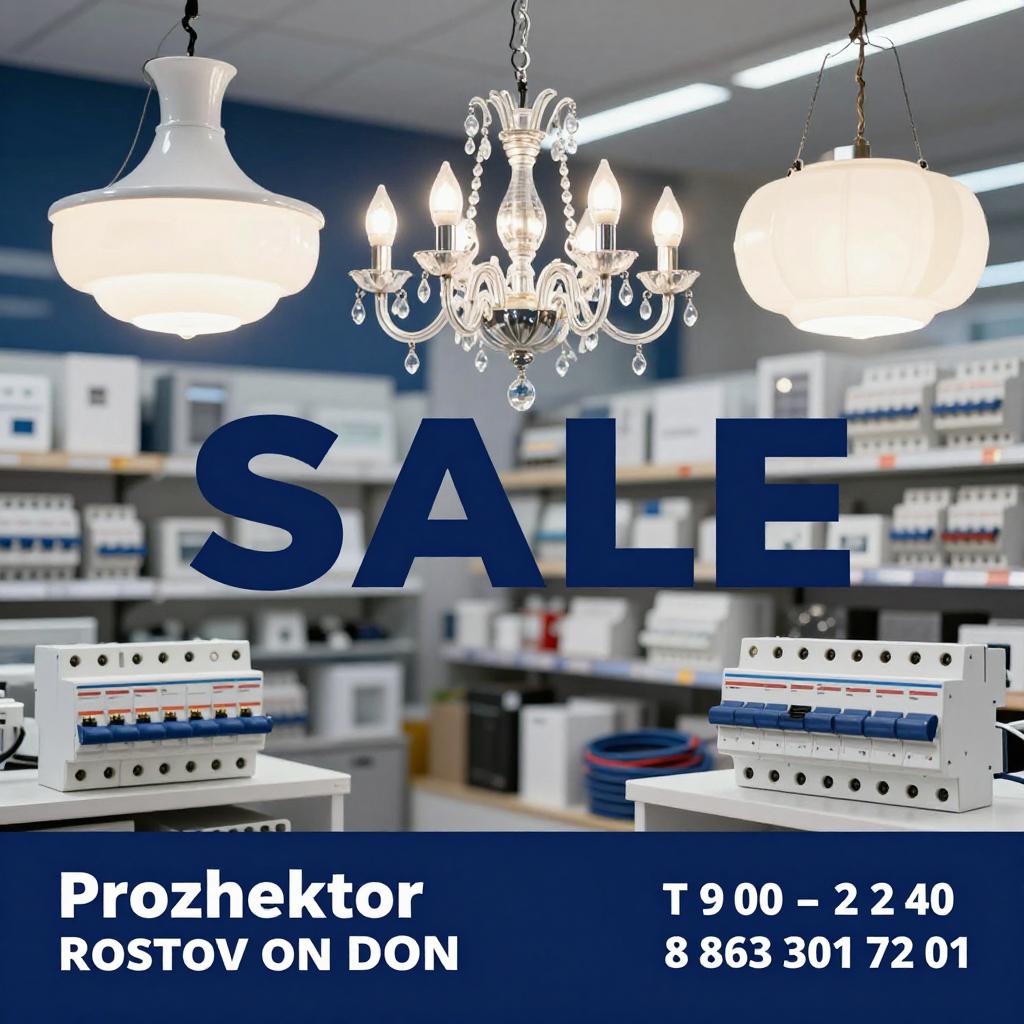 Широкий ассортимент: люстры, лампы, светодиодные ленты, провода, розетки, автоматы, СИП. Оплата: наличные, безнал, с НДС. Открыто с 9:00 до 19:00, Ростов-на-Дону, пр. Королёва 22Д, 2 этаж. Тел.: 8(863) 301-72-01, www.prozhektor.su, info@prozhektor.su