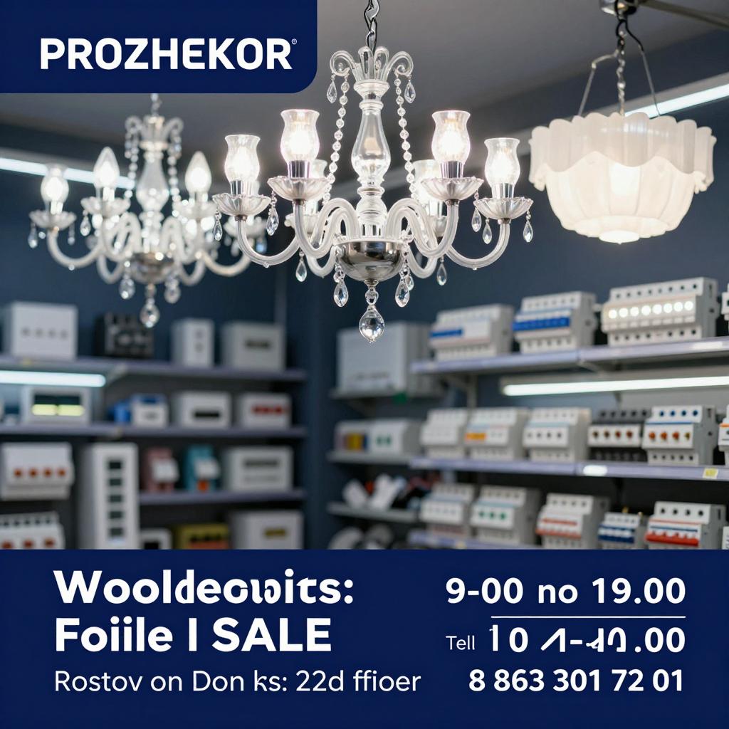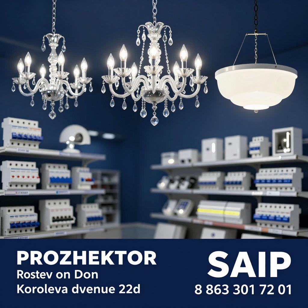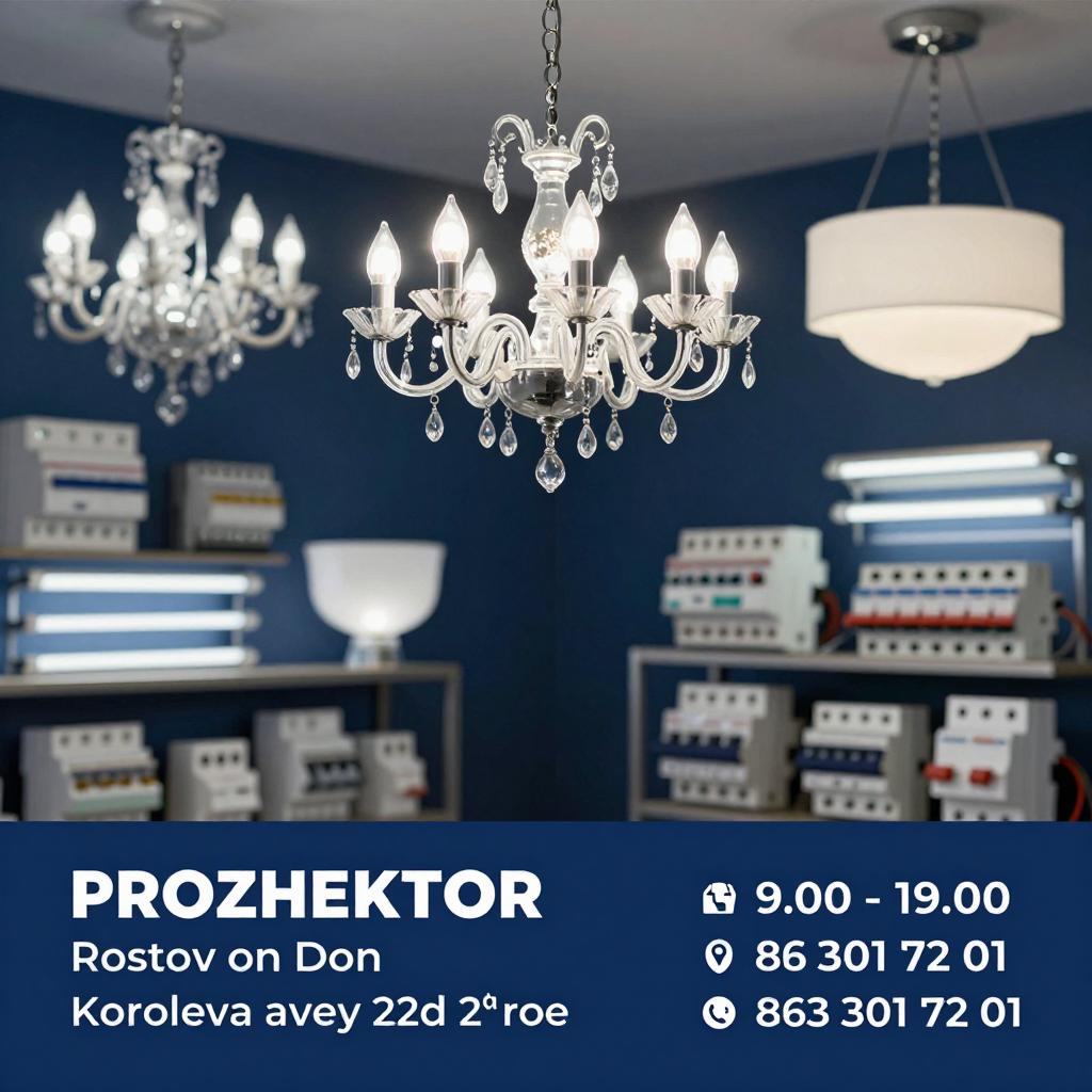 Широкий ассортимент: люстры, лампы, светодиодные ленты, провода, розетки, автоматы, СИП. Оплата: наличные, безнал, с НДС. Открыто с 9:00 до 19:00, Ростов-на-Дону, пр. Королёва 22Д, 2 этаж. Тел.: 8(863) 301-72-01, www.prozhektor.su, info@prozhektor.su